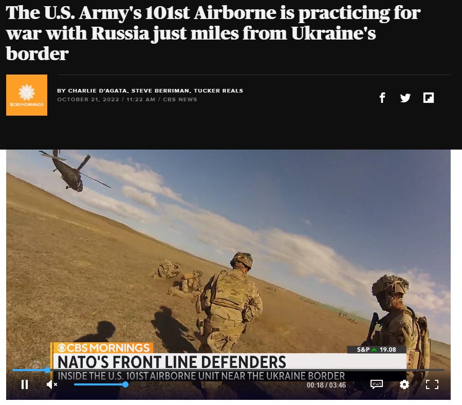 On October 21st - CBS reporters interview the commanders of the 101st Airborne Division, thousands of US light infantry stationed just across the Ukrainian border in Romania, who say they are there not on a “peacetime” but a combat “deployment”, and that they are prepared to cross the border into Ukraine to fight Russian forces on a “moment’s notice”.