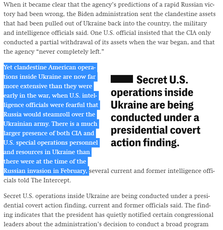 “There is a much larger presence of both CIA and U.S. special operations personnel and resources in Ukraine than there were at the time of the Russian invasion in February. Secret U.S. operations inside Ukraine are being conducted under a presidential covert action finding.”