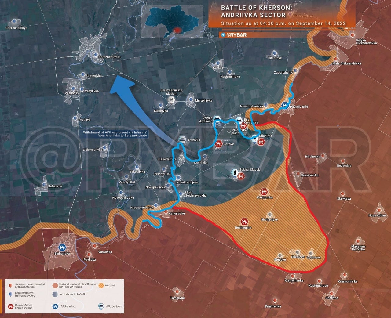 Likewise, repeated recent Russian missile strikes against reservoir dams in the city of Krivoy Rog have flooded the Ingulets River washing away the pontoon bridges that Kiev regime forces had erected across and were still using for their halted and failing counteroffensive on Russian-held Kherson. This effectively creates a cauldron of Kiev regime forces in their small bridgehead pocket in Russian lines, allowing them to be mopped up without hope of retreat, resupply, or reinforcement.