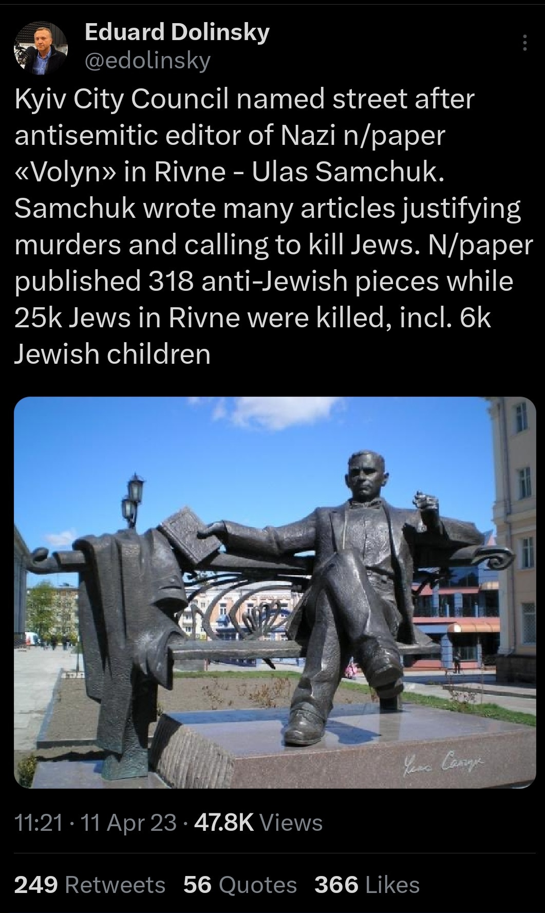 Samchuk wrote his anti-Jewish articles calmly cheerleading the massacre of 25,000 Jews in Rovno, including 6,000 children that it inspired. Incidentally a statue of Ulas Samchuk has also now been erected in Rovno