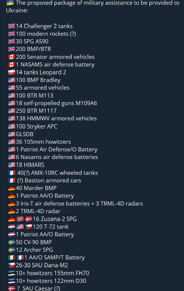 So far, a hodge podge variety of hundreds more infantry fighting vehicles, over a thousand more APCs, a couple hundred more artillery pieces, a token number of Western anti-aircraft systems, and a scattering of sundry pledged by the West falls far short of what Zaluzhny says he needs, and far far short of what the Kiev regime actually started this war with and has lost so far…